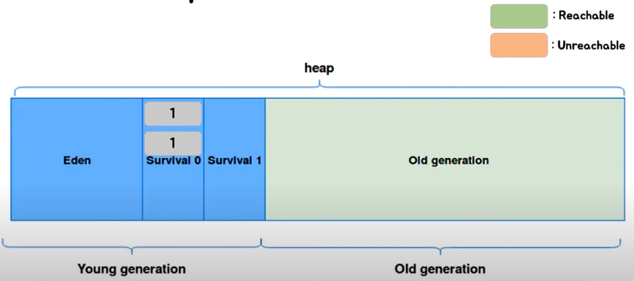 Eden영역이 꽉차고 꽉 찬 영역들이 생기면 minor GC가 되면서 Eden 영역이 Mark And Sweep이 진행되고 루트로부터 Reachable이라 판단된 객체는 Survival0 영역으로 옮겨진다. Minor GC에서 살아남을 때마다 1씩 증가(Age-bit)라고 한다.